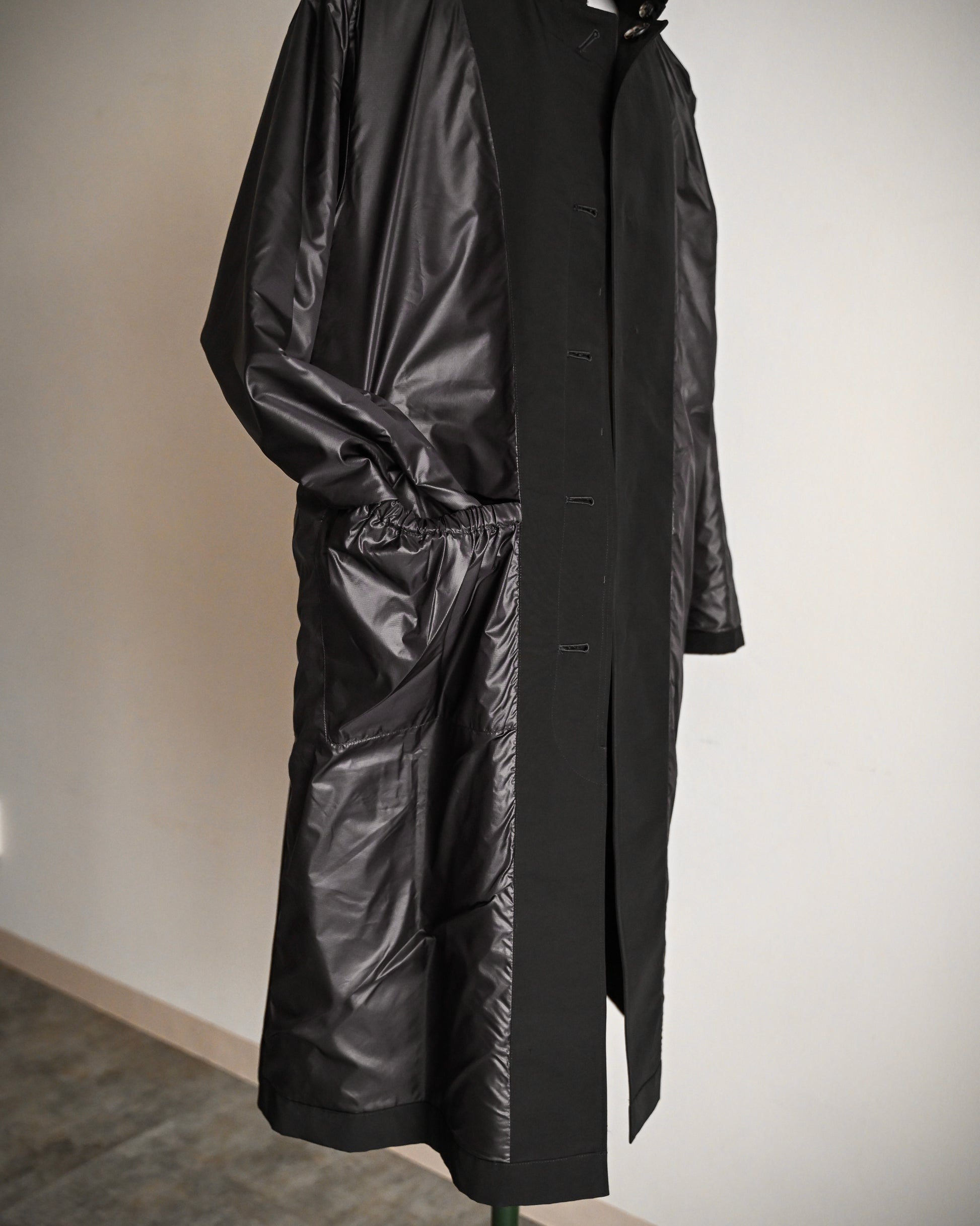 マウンテンパーカーなどで使用されることの多い、クラシック・アウトドア素材 60/40 CLOTH(ロクヨンクロス)をコートの表地に採用することで、軽く柔らか、かつ“カジュアルな感覚”で羽織れるコートとなっております。この"感覚"を重要視して生まれたプロダクトです。